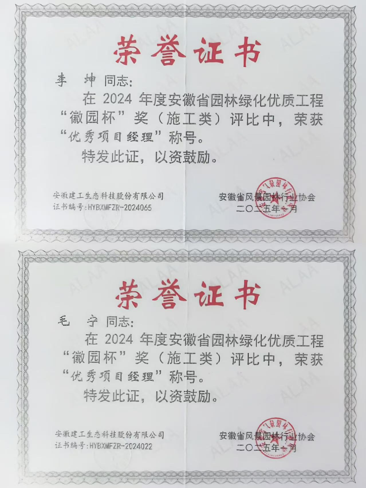 其中,生態(tài)科技公司榮獲2024年度優(yōu)秀會(huì )員單位;安建雍和府景觀(guān)綠化設計施工一體化工程榮獲施工類(lèi)金獎,五河縣沱湖湖濱帶(西壩口段)生態(tài)修復工程榮獲施工類(lèi)銀獎,五河縣沱湖省級自然保護區綜合治理項目一期(迎水面溝塘、圍堰生態(tài)修復)工程榮獲施工類(lèi)銅獎,蚌埠G329道路綠化養護項目榮獲養護類(lèi)銅獎;公司員工李坤、毛寧獲“優(yōu)秀項目經(jīng)理”榮譽(yù)稱(chēng)號。