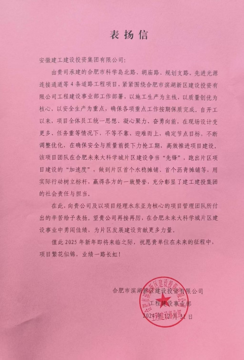 近期,建工建投集團喜訊頻傳,合肥市科學(xué)島北路、胡廟路、規劃支路、先進(jìn)光源連接通道等4條道路工程項目與長(cháng)豐下塘鎮城市更新余崗路等8條道路建設工程項目2標段先后收到業(yè)主單位合肥市濱湖新區建設投資有限公司和長(cháng)豐縣重點(diǎn)工程管理建設中心的表?yè)P信。