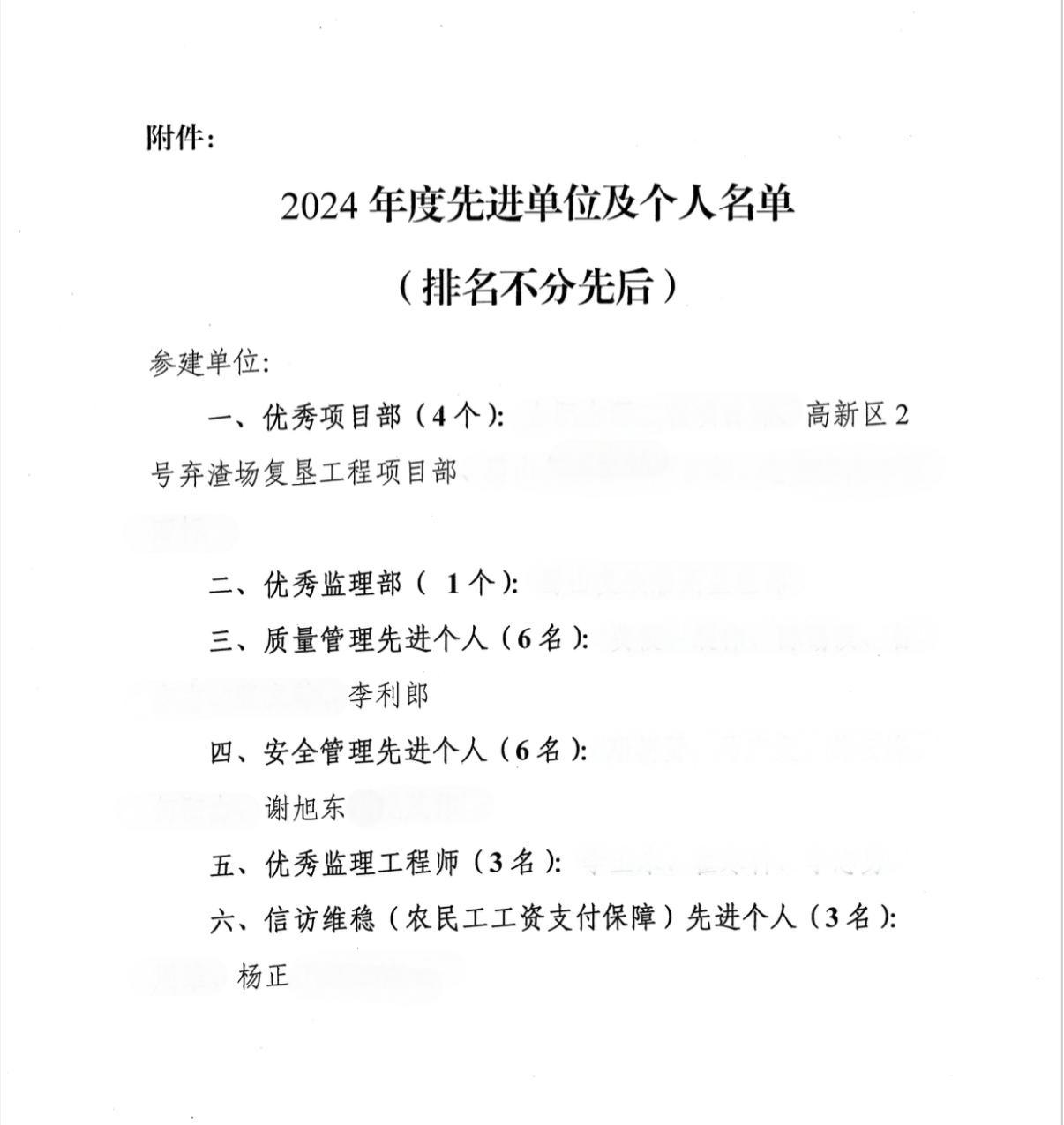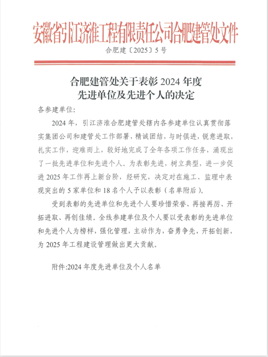 近日,建工路港高新區2號棄渣場(chǎng)復墾工程項目部受到業(yè)主單位安徽省引江濟淮工程有限責任公司合肥建管處表彰,合肥建管處授予項目部“優(yōu)秀項目部”榮譽(yù)稱(chēng)號,授予項目職工李利郎“質(zhì)量管理先進(jìn)個(gè)人”、謝旭東“安全管理先進(jìn)個(gè)人”、楊正“信訪(fǎng)維穩(農民工工資支付保障)先進(jìn)個(gè)人”榮譽(yù)稱(chēng)號。