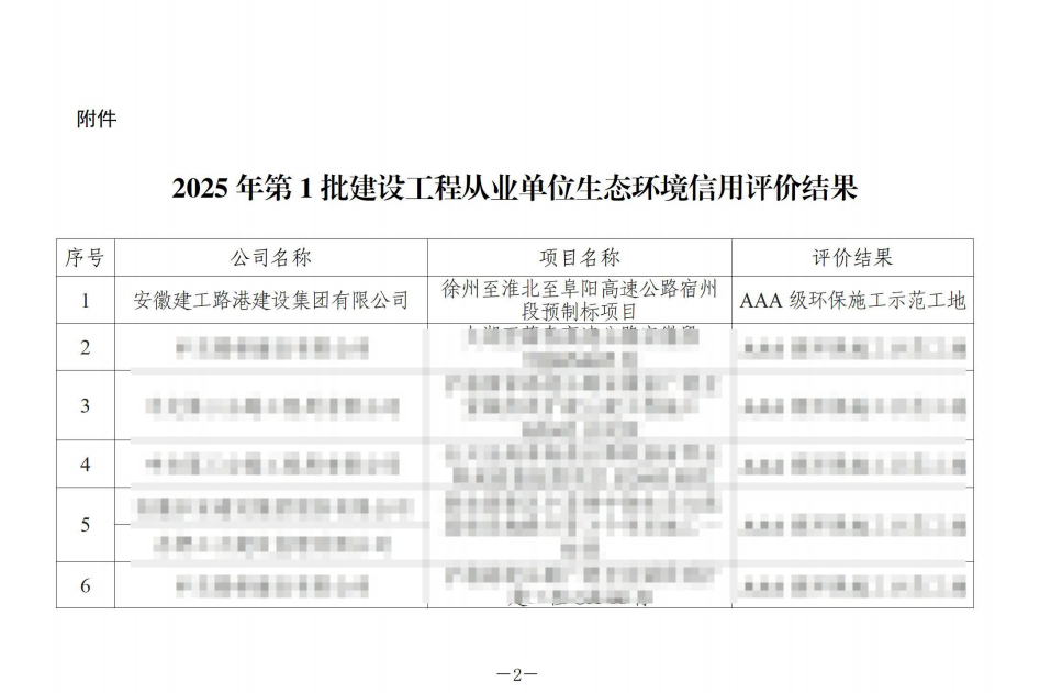 近日,安徽省環(huán)境保護產(chǎn)業(yè)協(xié)會(huì )公布了2025年第1批建設工程從業(yè)單位生態(tài)環(huán)境信用評價(jià)名單,由建工路港承建的徐州至淮北至阜陽(yáng)高速公路宿州段預制標項目榮獲“AAA級環(huán)保施工示范工地”榮譽(yù)稱(chēng)號。