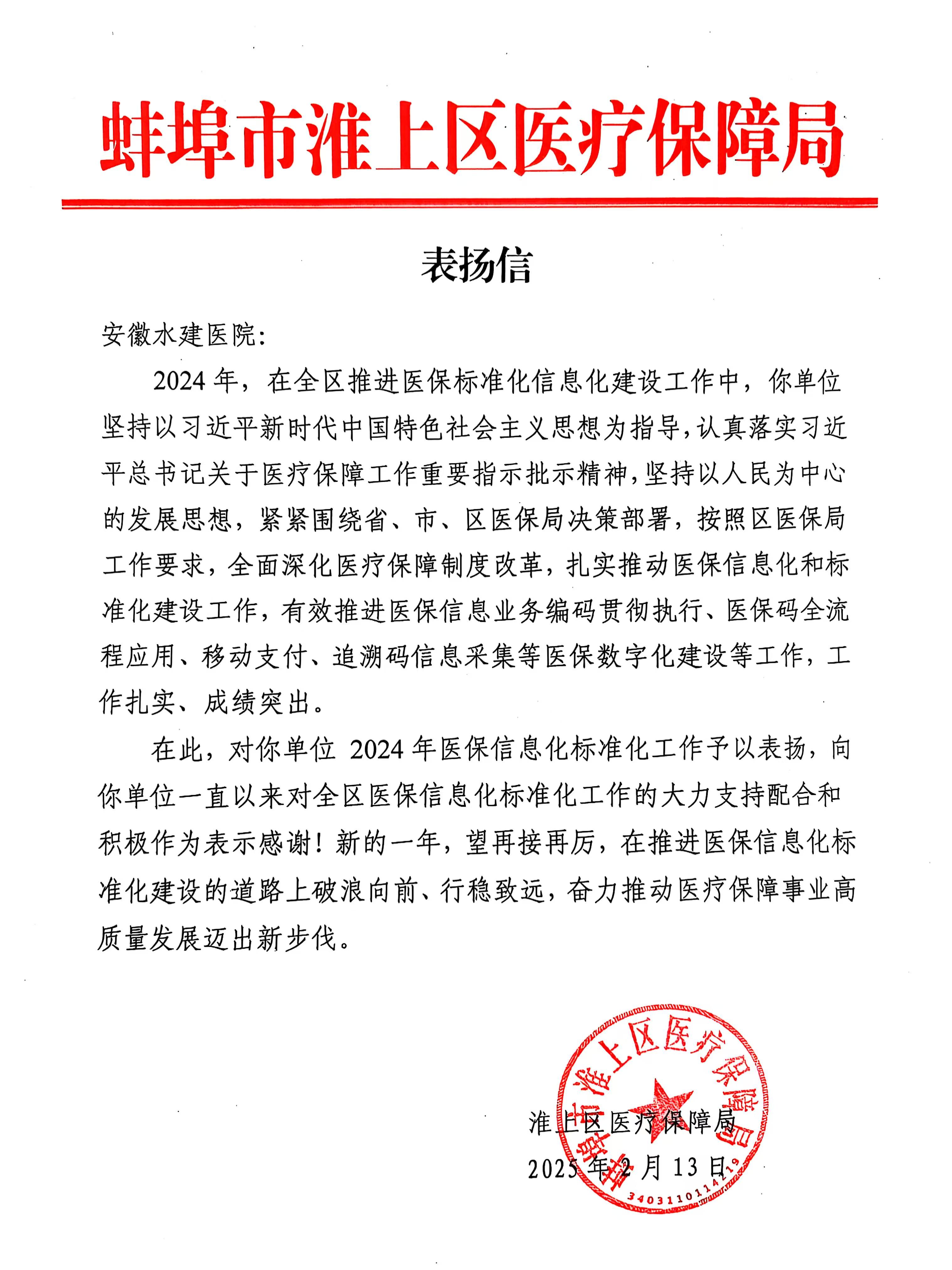 2月13日,安徽建工水建醫院醫保標準化信息化建設獲蚌埠市淮上區醫療保障局表?yè)P。表?yè)P信對醫院認真落實(shí)、及時(shí)響應省、市、區醫保信息化標準化工作安排部署,在醫保信息業(yè)務(wù)編碼貫徹執行、醫保碼全流程應用、移動(dòng)支付、醫保藥品追溯碼信息采集等工作中取得的工作成效給予充分肯定。