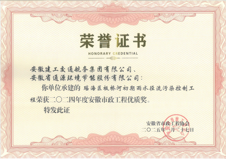 近日,安徽省市政工程協(xié)會(huì )公布了2024年度安徽省市政工程優(yōu)質(zhì)獎獲獎項目名單,由公司承建的瑤海區板橋河初期雨水徑流污染控制工程喜獲2024年度“安徽市政工程優(yōu)質(zhì)獎”。