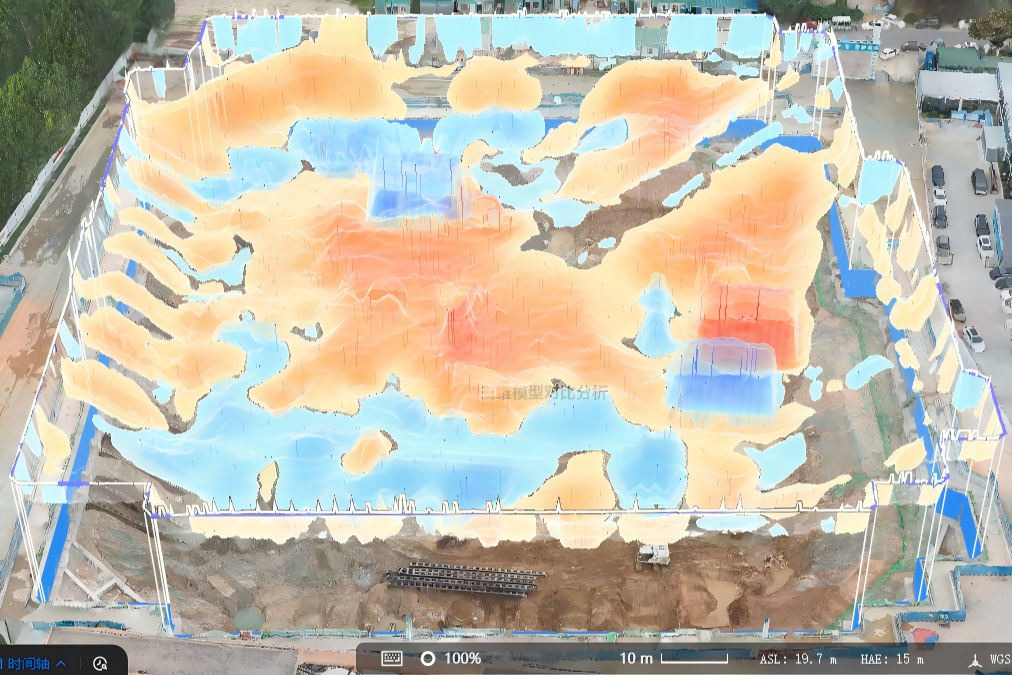 實(shí)景測量領(lǐng)域,無(wú)人機定時(shí)采集影像數據,經(jīng)自動(dòng)化建模生成高精度實(shí)景三維Mesh模型,與設計圖紙疊加后可一鍵提取長(cháng)度、高程、面積等工程參數,支持斷面計算分析,為土方調配、混凝土方量預算提供數據支撐,提高資源利用率、減少浪費。雨雪天氣前,還能依托實(shí)景模型計算坡度、預演運輸路徑,及時(shí)修整基坑邊坡與臨時(shí)道路,保障運輸安全。
