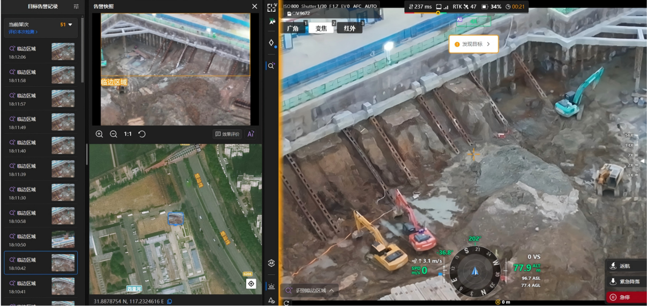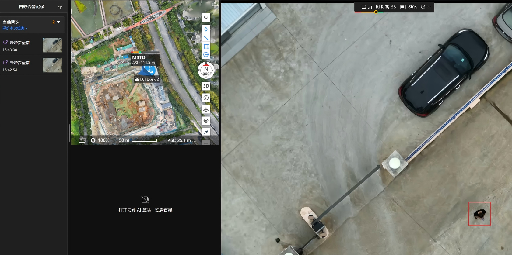 該項目部署具備定時(shí)自主飛行與實(shí)時(shí)傳輸能力的無(wú)人機機場(chǎng)系統,結合AI算法引擎實(shí)現施工現場(chǎng)精度還原與目標智能感知。在安全管理方面,無(wú)人機按預設航線(xiàn)自動(dòng)巡檢或遠程操控,實(shí)時(shí)回傳畫(huà)面,AI大模型視覺(jué)算法可自動(dòng)識別未帶安全帽、臨邊區域等隱患,觸發(fā)告警并記錄目標信息,助力管理人員快速排查處置,擴大巡查范圍、縮短隱患處置時(shí)間,提升安全管理效率。