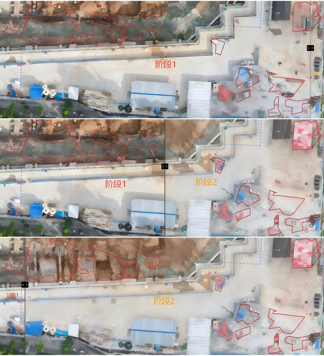 通過(guò)空間模型與時(shí)間軸結合,系統對多時(shí)間點(diǎn)二維、三維及斷面模型數據自動(dòng)比對,直觀(guān)呈現土方開(kāi)挖變化與工程進(jìn)度,為進(jìn)度計劃制定和優(yōu)化提供支撐。同時(shí),AI圖像比對技術(shù)可自動(dòng)識別不同時(shí)間點(diǎn)模型間的差異區域,實(shí)現施工區域動(dòng)態(tài)變化精準監控。