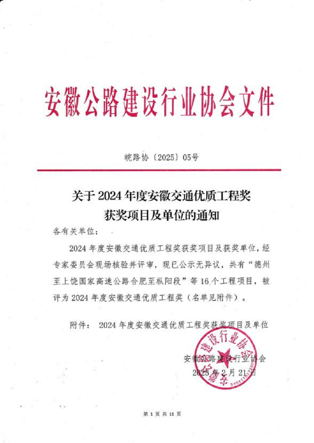 近日,安徽公路建設行業(yè)協(xié)會(huì )發(fā)布通知文件,公布2024年度安徽交通優(yōu)質(zhì)工程獎評選結果及單位名單,共16個(gè)工程項目獲獎。