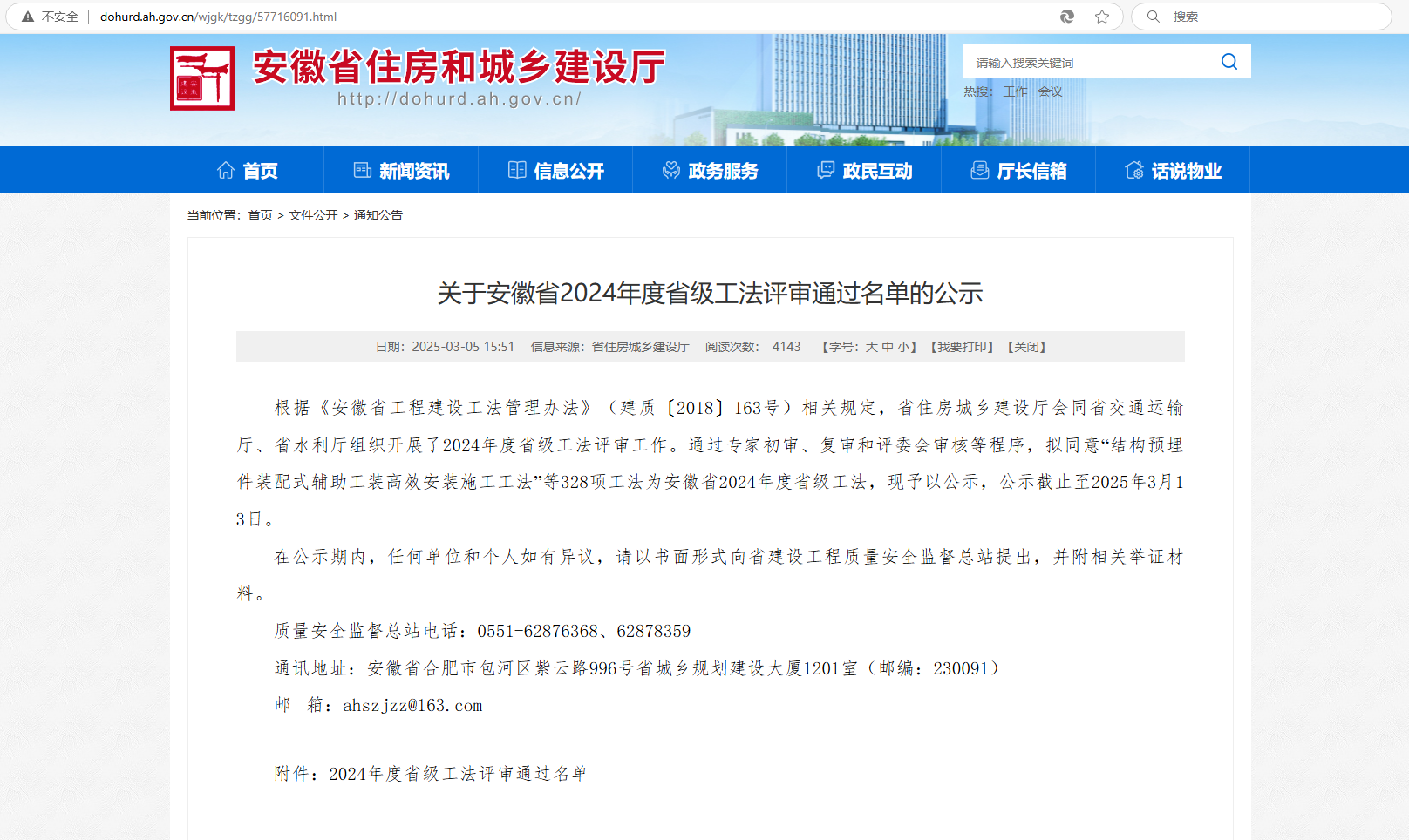 安徽省工程建設工法是全省工程建設領(lǐng)域的重要技術(shù)創(chuàng )新成果,以工程為對象,以工藝為核心,運用系統工程原理,把先進(jìn)技術(shù)和科學(xué)管理結合起來(lái),經(jīng)過(guò)一定工程實(shí)踐形成的綜合配套的施工方法,體現了當前建筑業(yè)綠色化、智能化、工業(yè)化的發(fā)展趨勢。