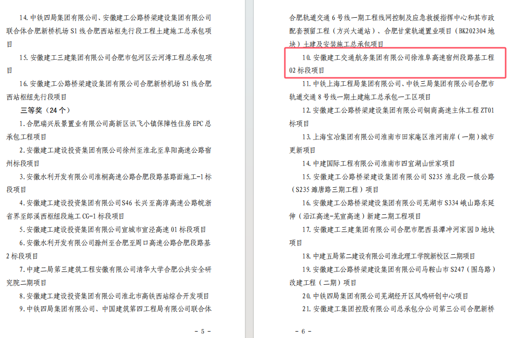 近日,安徽省住房和城鄉建設廳、安徽省總工會(huì )聯(lián)合發(fā)布《關(guān)于表?yè)P 2024 年度安徽省重大項目建設勞動(dòng)競賽優(yōu)秀項目的通報》,公司潭沖河家園 D、E 地塊 EPC 總承包項目和徐淮阜高速宿州段路基工程 02 標項目表現突出,成功入選優(yōu)秀項目名單。