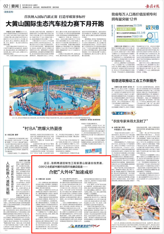 8月6日,安徽日報以“近日,淮桐高速控制性工程紫蓬山隧道全線(xiàn)貫通,G9912合肥都市圈環(huán)線(xiàn)西環(huán)線(xiàn)建設提速——合肥'大外環(huán)'加速成形”為題,專(zhuān)題報道了由建工路港公司承建的淮桐高速項目建設進(jìn)展情況。