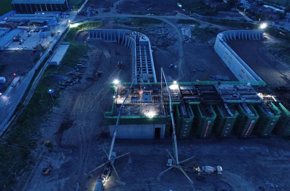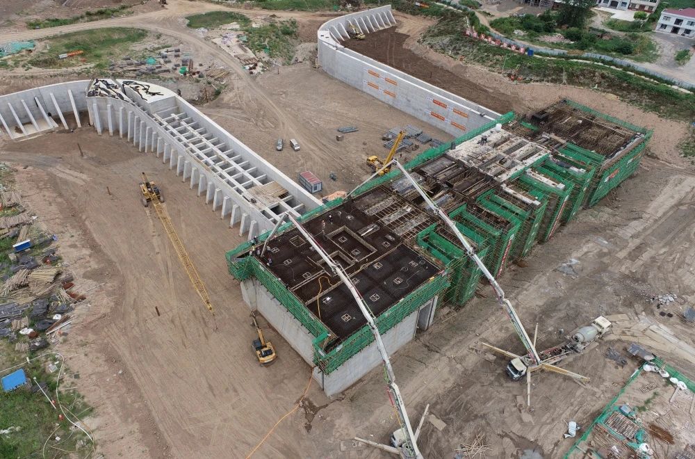 6日上午10時(shí)30分正式開(kāi)倉,項目部投入2臺汽車(chē)泵、16輛攪拌車(chē)及50余名施工人員。為確保高溫下混凝土施工質(zhì)量,項目部采取預埋冷卻水管、加冰降溫、灑水養護等技術(shù)措施,嚴控混凝土溫度;各班組輪番作業(yè)、緊密配合,克服高溫不利影響,最終圓滿(mǎn)完成澆筑任務(wù),為工程整體推進(jìn)提供了有力保障。