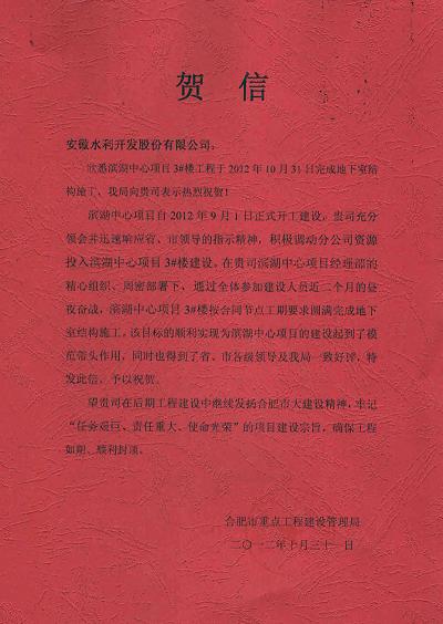 近日,合肥市重點(diǎn)工程局向安徽水利發(fā)來(lái)賀信,祝賀安徽水利合肥分公司承建的濱湖中心項目3#樓工程圓滿(mǎn)完成地下室結構施工。