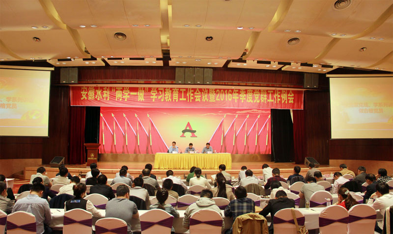 2016年5月10日下午,安徽水利召開(kāi)了“兩學(xué)一做”學(xué)習教育工作會(huì )議暨2016年季度黨群工作例會(huì ),傳達集團公司“兩學(xué)一做”學(xué)習教育工作會(huì )議精神,動(dòng)員和部署公司“兩學(xué)一做”學(xué)習教育工作,安排下一季度黨群工作。公司領(lǐng)導,所屬各單位黨總支(支部)書(shū)記、工會(huì )主席、團支部書(shū)記,工會(huì )、紀檢監察室、黨委工作部和團委全體人員,“五四”受表彰人員參加了會(huì )議。