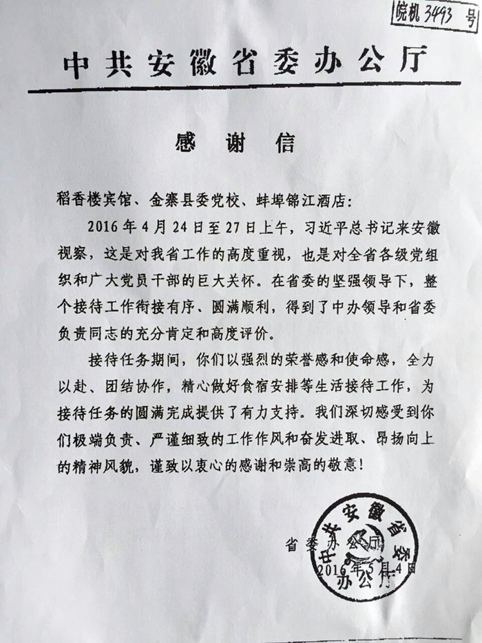 省委辦公廳發(fā)來(lái)感謝信肯定安徽水利錦江大酒店接待工作