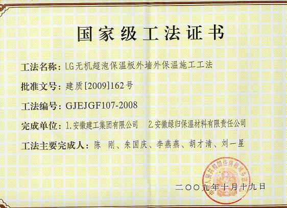 3月29日,國家級工法成果推廣與經(jīng)驗交流研討會(huì )在北京召開(kāi)。原建設部副部長(cháng)、中國建筑業(yè)協(xié)會(huì )會(huì )長(cháng)鄭一軍,住房和城鄉建設部總經(jīng)濟師李秉仁等出席研討會(huì )。會(huì )議向獲得2007年-2008年度國家級工法的完成單位頒發(fā)了獎牌和證書(shū)。安徽建工集團有限公司編制的《LG無(wú)機超泡保溫板外墻外保溫施工工法》(GJEJEF107-2008)被評為國家級工法,此次國家級工法的申報成功,不僅是集團公司堅持技術(shù)創(chuàng )新取得又一突破,更為集團公司特級資質(zhì)就位奠定了一定的基礎。