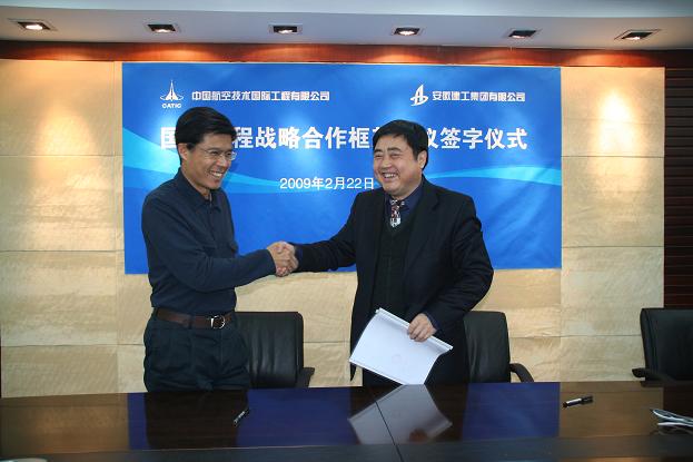 The president of ACEG Mr.Hu Yuncheng signed the framework agreement of strategic cooperation with the president of China National Aero-Technology International Engineering Company Mr. Liu Rongchun in Beijing on 22 February 2009. Both sides agreed to advance the all-round cooperation in international market, especially in Africa such as Algeria where both companies can realize the mutual complementarities and sharing the benefits and risks and mutual benefits and win-win. Both companies will take a certain project as the beginning of cooperation and then gradually shift to the all-round strategic cooperation.