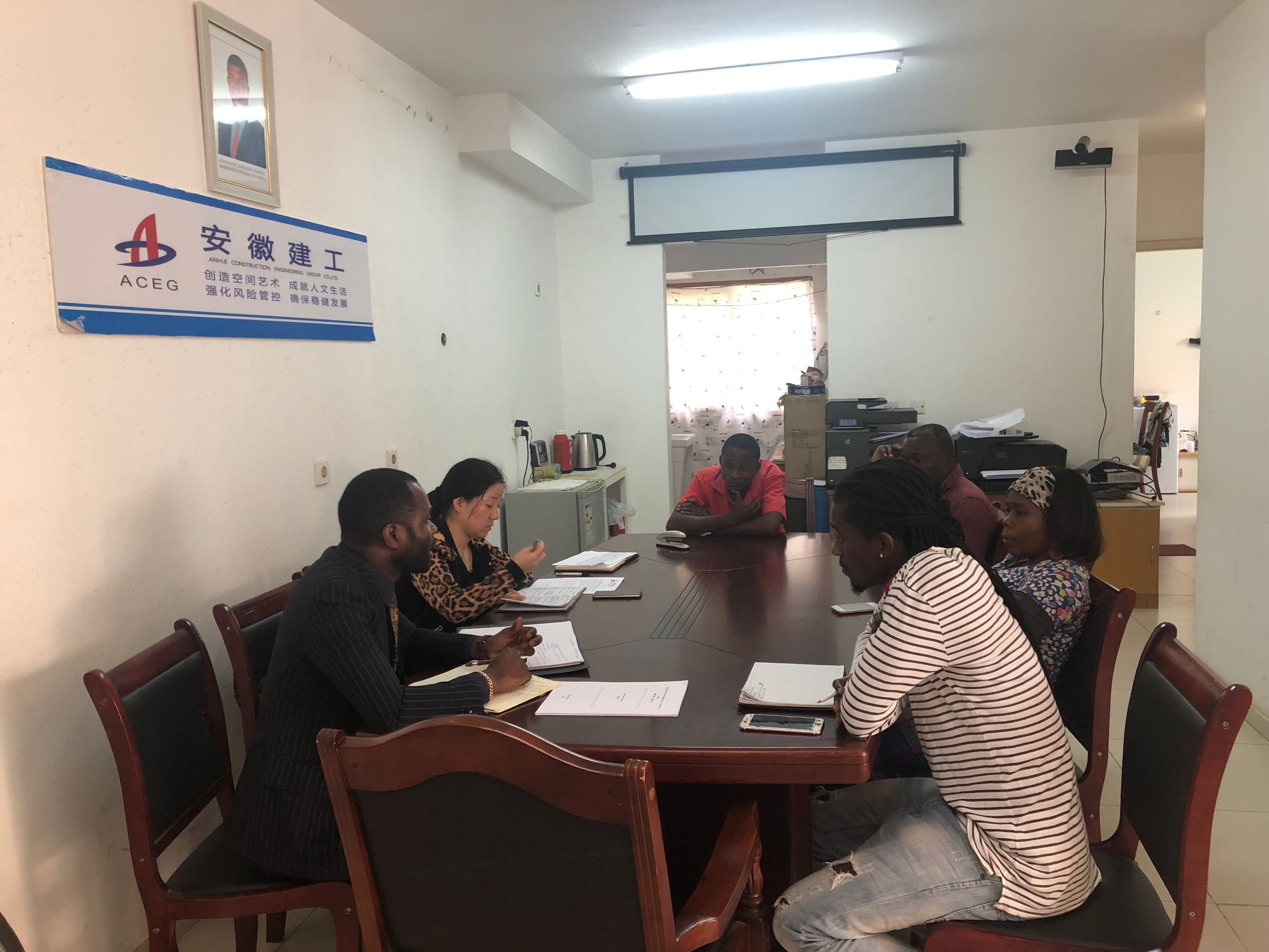 In order to develop a better local staff management system standardizing the management of local Angolan staff, ACEG Angolan Branch held an opinion gathering meeting attended by all the local employees with the Branch`s headquarters on the morning of August 8 local time, the meeting was presided over by Yanyan Ma, Director of the Office of the Branch, and Mr. Logan, the Corporate Lawyer also attended the meeting.