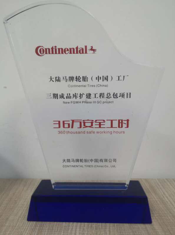 Continental Tires Co., Ltd. (China) has recently given Anhui Province Industrial Equipment Installation Co., Ltd. - one of ACEG`s subsidiaries, professionalized contractor for industrial equipment installation and related businesses,a High-quality contractor medal and a 360 thousand safe working hours cup, for the remarkable completion of the Project - Phase III of the finished products warehouse expansion.